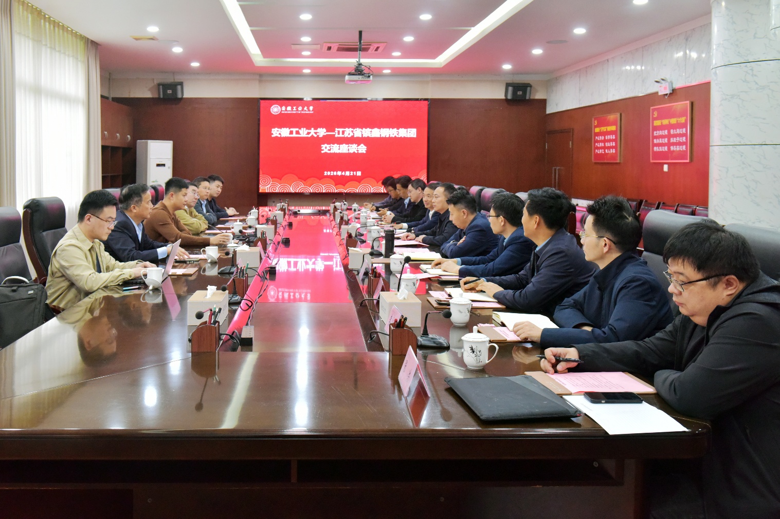 4月21日下午,江苏省镔鑫钢铁集团有限公司董事长、总裁林滔一行来校交流座谈。校党委副书记、校长曾杰出席座谈会,校党委常委、副校长郑利平主持会议。镔鑫钢铁集团总工程师程乃良、副总工程师吴建中,技术研发部、福建铭泰嘉讯信息技术有限公司、江苏紫气金诚贸易有限公司相关负责人,我校研究生院、科研院、冶金工程学院、材料科学与工程学院、能源与环境学院相关负责人参加座谈。