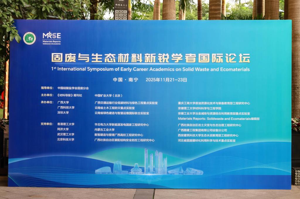 2025年11月21-23日,由《材料导报》期刊社与中国矿业大学(北京)联合主办的首届固废与生态材料新锐学者国际论坛在广西南宁顺利召开。本次论坛邀请中国硅酸盐学会固废分会作为指导单位,由冶金减排与资源综合利用教育部重点实验室等单位联合承办。论坛共吸引来自国内外百余所高校、科研院所及高技术企业的300余位专家学者齐聚一堂,共同探讨固废资源化与生态材料发展前沿。