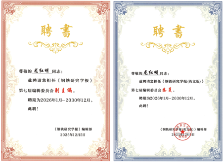 近日,《钢铁研究学报》(中、英文版)第七届编委会成立大会在北京隆重举行。中国钢研集团副总经理、两刊主编赵栋梁、钢研总院党委书记总经理梁剑雄莅临会议。会上,我院龙红明教授受邀成为该期刊的副主编,同时受邀续聘《钢铁研究学报(英文版)》编委会成员。龙红明教授长期活跃于冶金学术领域,目前已担任《中国冶金》副主编,以及《钢铁》、《IJMMM》、《工程科学学报》、《烧结球团》等期刊编委。此次获聘,既是业内高水平期刊对我校冶金学科发展成果的权威认定,也充分彰显了学术界对龙红明教授在该领域卓越贡献与学术影响力的高度认可。